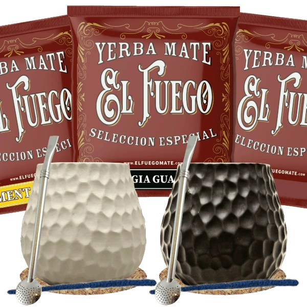 Sada Yerba Mate pro dva: vzorky El Fuego 3x50g + 2x Kalabása + 2x Bombilla